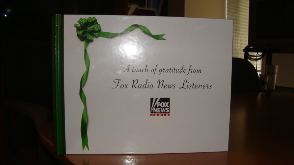 The long roll poster card and printed book of all signatures has arrived at FOX News Radio headquarters in NY. Here are a few photos of our hosts and affiliate sales folks with both. A copy of each was sent to troops in Afghanistan and Iraq at the same time. As soon as photos, or videos are available we will post them here.