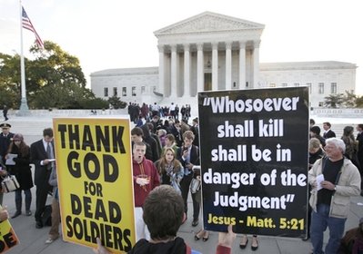 Westboro Baptist Church member Jacob Phelps, of Topeka, Kan., holds signs as people engage him in front of the Supreme Court in Washington, Wednesday, Oct. 6, 2010. The court is hearing arguments Wednesday in the dispute between Albert Snyder of York, Pa., and members of the Westboro Baptist Church. The case pits Snyder’s right to grieve privately against the church members’ right to say what they want, no matter how offensive. (AP Photo/Carolyn Kaster)