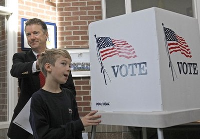 Kentucky Republican Senate candidate Rand Paul rubs the head of his 11-year-old son Robert after filling out his ballot in Bowling Green, Ky., Tuesday, Nov. 2, 2010. (AP Photo/Ed Reinke)