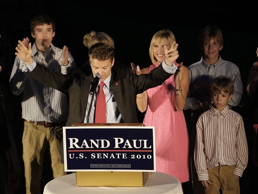 Republican U.S. Senate candidate Rand Paul raises his arms to the cheers of supporters at his victory party in Bowling Green, Ky., Tuesday, May 18, 2010. At left is Paul’s son William. At right is his wife Kelley and sons Duncan, top, and Robert. (AP Photo/Ed Reinke)