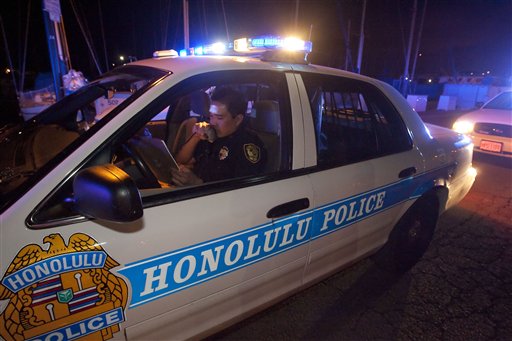 A police officer with the Honolulu Police Department talks through his public address system warning boat owners in the Ala Wai Yacht Harbor to evacuate Thursday, March 10, 2011 in Honolulu. The state of Hawaii is under a tsunami warning due to a large 8.9 earthquake off Japan. The earthquake is believed to have generated a tsunami wave. The Pacific Tsunami Center expects the wave to hit Hawaii at 3:20 a.m. Hawaiian Standard Time. (AP Photo/Eugene Tanner)