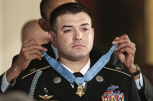 President Barack Obama awards US Army Sgt. First Class Leroy Arthur Petry the Medal of Honor during a ceremony in the East Room of the White House in Washington, Tuesday, July 12, 2011. Petry is the ninth service member to have been named a recipient of the Medal of Honor for actions in Afghanistan and Iraq. (AP Photo/Pablo Martinez Monsivais)