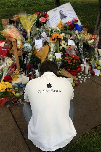 An unidentified man crouches in front of a memorial the day after the death of Steve Jobs at Apple headquarters Thursday, Oct. 6, 2011 in Cupertino, Calif. Jobs, the Apple founder and former CEO who invented and masterfully marketed ever-sleeker gadgets that transformed everyday technology, from the personal computer to the iPod and iPhone, has died. He was 56. (AP Photo/Marcio Jose Sanchez)