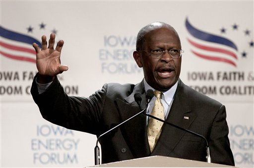 Republican presidential candidate businessman Herman Cain speaks at the Iowa Faith and Freedom Coalition presidential candidate forum, in Des Moines, Iowa, Saturday, Oct. 22, 2011. A half-dozen GOP contenders flocked to Iowa on Saturday, barely 10 weeks before the state’s Jan. 3 caucuses. (AP Photo/Nati Harnik)