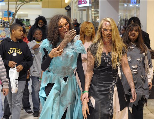 Participants in the inaugural Zombie Walk at Holly Hill Mall in Burlington, N.C. walk around shoppers in Burlington, N.C. Saturday, Oct. 29, 2011. All three work at The Original Hollywood Horror Show haunted house in Snow Camp, N.C. The walk took place inside the mall with proceeds going to two local charities. (AP Photo/Burlington Times-News, Scott Muthersbaugh)
