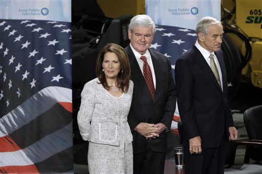 Republican presidential candidates, from left, Rep. Michele Bachmann, R-Minn., former House Speaker Newt Gingrich and Rep. Ron Paul, R-Texas, stand on stage before the Republican Presidential Forum on Manufacturing, Tuesday, Nov. 1, 2011, in Pella, Iowa. (AP Photo/Charlie Neibergall)