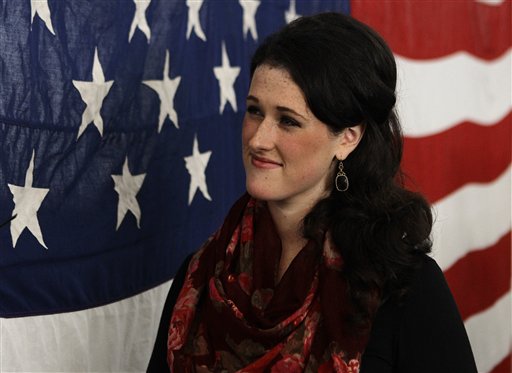 Elizabeth Santorum, eldest daughter of Republican presidential candidate, former Pennsylvania Sen. Rick Santorum, campaigns for her father in a hanger at Sarasota Bradenton International Airport in Sarasota, Fla., Sunday, Jan. 29, 2012, where Santorum was ascheduled to appear. He is staying home in Philadelphia to be with his 3-year-old hospitalized daughter Isabella. (AP Photo/Paul Sancya)