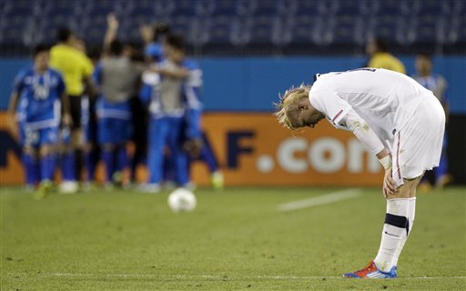 Brek Shea, right, of the United States, pauses on the field as El Salvador players, left, celebrate after scoring a goal in extra time causing a 3-3 draw in a CONCACAF Olympic qualifying soccer match on Monday, March 26, 2012, in Nashville, Tenn. The tie game eliminated the United States from Olympic qualifying. (AP Photo/Mark Humphrey)