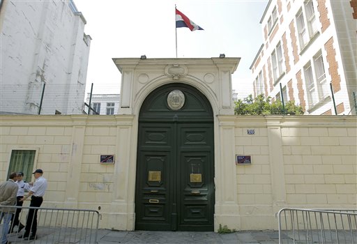 A French police officer stands guard outside the Syrian embassy in Paris Tuesday, May 29, 2012. French President Francois Hollande says Syria’s ambassador is being expelled amid continuing violence by Syrian government forces against civilians and opposition members. Governments around the world expelled ambassadors and top Syrian diplomats Tuesday in an unusually coordinated blow to Syria’s leaders, after a particularly gruesome massacre in which the United Nations says families, including children, were shot at close range in their homes. Cranking up the pressure on increasingly isolated Syrian President Bashar Assad, France, Germany, Italy and Spain said they were kicking out Syria’s ambassadors in their countries.(AP Photo/Jacques Brinon)