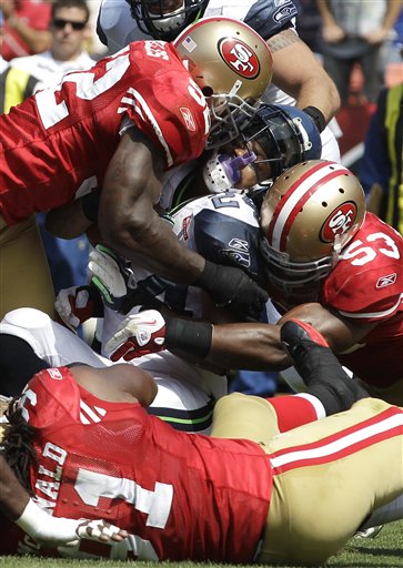 FILE – In this Sept. 11, 2011 file photo, San Francisco 49ers linebackers Patrick Willis (52),backer NaVorro Bowman (53), and defensive tackle Ray McDonald (91) tackling Seattle Seahawks running back Marshawn Lynch (24) during the first quarter of an NFL football game in San Francisco. They are not only the biggest reason behind the 49ers’ defensive success, they are a close bunch that has quickly become the new NFL standard for linebackers. Meet Patrick Willis, NaVorro Bowman, Aldon Smith and Ahmad Brooks. (AP Photo/Paul Sakuma, File)