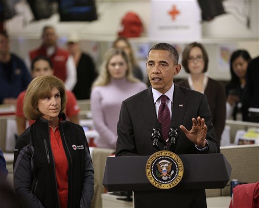 President Barack Obama, accompanied by American Red Cross President and CEO Gail J. McGovern, gestures while speaking during the his visit to the Disaster Operation Center of the Red Cross National Headquarter to discuss superstorm Sandy, Tuesday, Oct. 30, 2012, in Washington. (AP Photo/Pablo Martinez Monsivais)