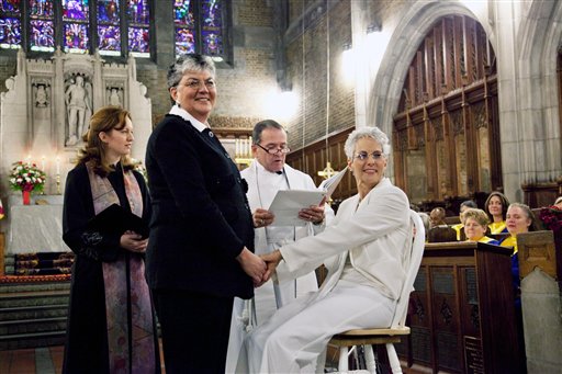 In this photo provided by Outserve-SLDN, Brenda Sue Fulton, center left, and Penelope Gnesin, hold hands while exchanging wedding vows at the U.S. Military Academy at West Point, N.Y., Saturday, Dec. 1, 2012. Their ceremony marks the first time a same sex couple had their wedding in the Cadet Chapel, the landmark gothic church that is a center for spiritual life at the Academy. The chaplain and woman at left are unidentified. (AP Photo/Outserve-SLDN, Jeff Sheng)