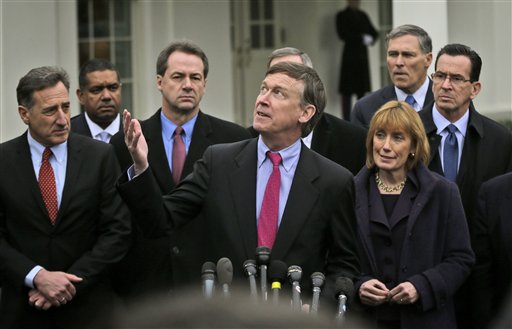 Colorado Gov. John Hickenlooper, center, accompanied by fellow members of the Democratic Governors Associations, looks up to the overcast sky, outside the White House in Washington, Feb. 22, 2013, following their meeting with President Barack Obama and Vice President Joe Biden. From left are, Vermont Gov. Peter Shumlin, Virgin Island Gov. John de Jongh, Montana Gov. Steve Bullock, Hickenlooper, New Hampshire Gov. Maggie Hassan, Washington Gov. Jay Inslee and Connecticut Gov. Dan Malloy. (AP Photo/Pablo Martinez Monsivais)