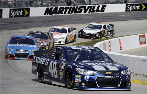 Jimmie Johnson (48) drives out of Turn 4 during the STP 500 NASCAR Sprint Cup series auto race at Martinsville Speedway in Martinsville, Va., Sunday, April 7, 2013. (AP Photo/Steve Helber)