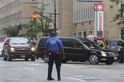 A hearse arrives at the the Cathedral Church of Saint John the Divine ahead of the funeral service for James Gandolfini, Thursday, June 27, 2013 in New York. Gandolfini, who played Tony Soprano in the HBO show “The Sopranos,” died while vacationing in Italy last week. (AP Photo/Mary Altaffer)