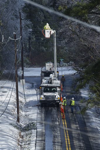 Repair crews work Thrusday Feb. 13, 2014, to restore power after a winter storm Wednesday downed power lines and continue to blow transformers on Thursday, Feb. 13, 2014, in Fairburn, Ga. Georgia Power said about 462,000 homes and businesses have lost power at some point during the storm, though about 200,000 have had service restored. (AP Photo/John Amis)
