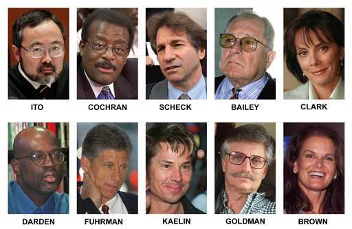 This undated file photo combo shows some of the people in the televised courtroom saga of O.J. Simpson, which made household names of prosecutors, defense lawyers, family friends, even a houseguest. Pictured, top row from left are Los Angeles Superior Court Judge Lance Ito; defense co-counsel Johnnie L. Cochran Jr.; defense DNA expert Barry Scheck; defense co-counsel F. Lee Bailey; and lead prosecutor Marcia Clark. Bottom row, from left: co-prosecutor Christopher Darden; Los Angeles Police detective Mark Fuhrman; Simpson house guest Brian “Kato” Kaelin; victim Ron Goldman’s father Fred Goldman; and Denise Brown, sister of victim Nicole Brown Simpson. (AP Photo/File)