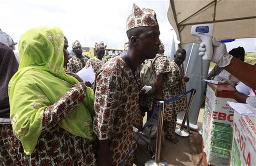 A Nigerian port health official uses a thermometer to screen Muslim pilgrims for Ebola at the Hajj camp before boarding a plane for Saudi Arabia at the Murtala Muhammed International Airport in Lagos, Nigeria Thursday, Sept, 18. 2014. ( AP Photo/Sunday Alamba)
