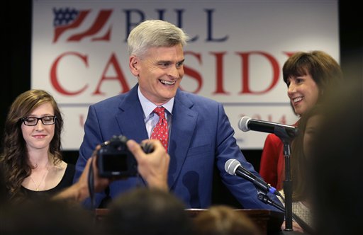 Louisiana Republican Senate candidate Rep. Bill Cassidy, R-La., who is challenging incumbent Sen. Mary Landrieu, D-La., addresses supporters during his election night watch party in Baton Rouge, La., Tuesday, Nov. 4, 2014. At left is his daughter Meg Cassidy, and right is his wife Laura Cassidy. Cassidy and Landrieu will face each other in a runoff. (AP Photo/Gerald Herbert)