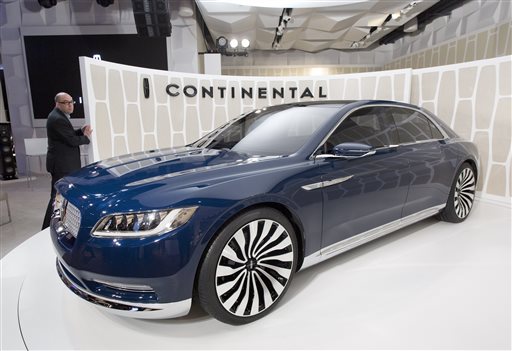 A Lincoln Continental concept car is shown at the New York International Auto Show, Monday, March 30, 2015, in New York. Thirteen years after the last Continental rolled off the assembly line, Ford Motor Co. is resurrecting its storied nameplate. The production version of the full-size sedan goes on sale next year. (AP Photo/Mark Lennihan)