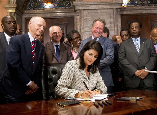 South Carolina Gov. Nikki Haley signs a bill into law as former South Carolina governors and officials look on Thursday, July 9, 2015, at the Statehouse in Columbia, S.C. The law enables the removal of the Confederate flag from the Statehouse grounds more than 50 years after the rebel banner was raised to protest the civil rights movement. (AP Photo/John Bazemore)