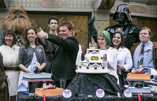 Australian Star Wars fans, Andrew Porters and Caroline Ritter get married at the forecourt of Hollywood’s TCL Chinese Theater IMAX in Los Angeles Thursday, Dec. 17, 2015. The couple stood alongside a wedding party of ?Star Wars? characters, including Chewbacca, top left, and Darth Vader, top right. (AP Photo/Damian Dovarganes)