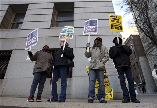 Demonstrators hold up their signs outside the courthouse of the trial of Caesar R. Goodson Jr. one of six Baltimore city police officers charged in connection to the death of Freddie Gray, Monday, Jan. 11, 2016, in Baltimore Md. Officer Goodson Jr., was driving the police van in which Gray suffered a fatal neck injury. Maryland courts spokesman Terri Charles said Monday that Officer Caesar Goodson’s trial is postponed indefinitely, pending further proceedings before the state Court of Special Appeals.(AP Photo/Jose Luis Magana)