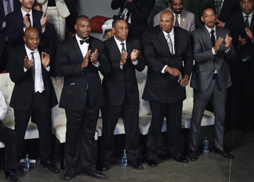 Pallbearers Mike Tyson, left, Lennox Lewis, second from left, Will Smith, right, and Mike Moorer, second from right, stand during Muhammad Ali’s memorial service, Friday, June 10, 2016, in Louisville, Ky. Pallbearer at center is unidentified. (AP Photo/Darron Cummings)