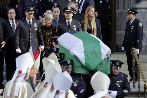 New York City Police Dept. Sgt. Conor McDonald, center, and Patricia McDonald, third left, the son and widow of NYPD Detective Steven McDonald, follow his casket as it leaves St. Patrick’s Cathedral after his funeral, in New York, Friday, Jan. 13, 2017. McDonald died on Tuesday, 30 years after a robbery suspect shot him in Central Park. The officer publicly forgave his assailant and went on to become an international voice for peace. (AP Photo/Richard Drew)