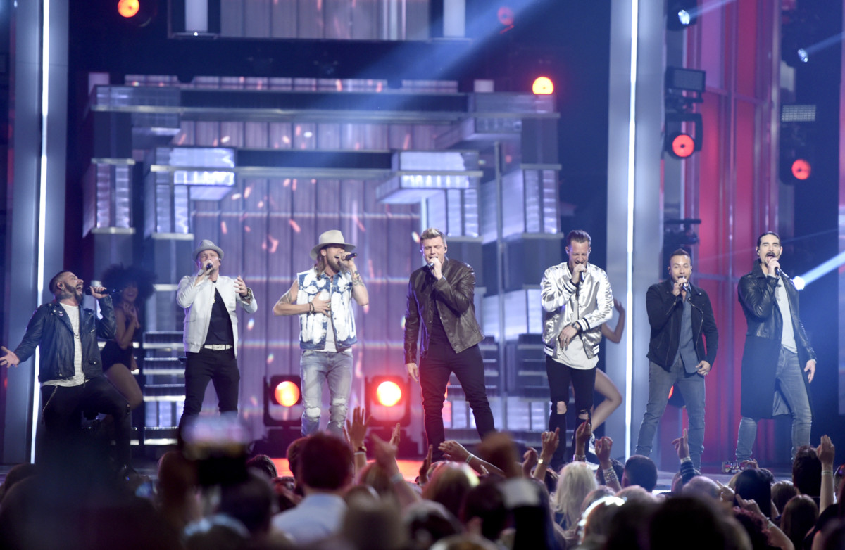 Brian Kelley, third from left, and Tyler Hubbard, third from right, of Florida Georgia Line, and from left, AJ McLean, Brian Littrell, Nick Carter, Howie Dorough, and Kevin Richardson, of Backstreet Boys, perform at the 52nd annual Academy of Country Music Awards at the T-Mobile Arena on Sunday, April 2, 2017, in Las Vegas. (Photo by Chris Pizzello/Invision/AP)