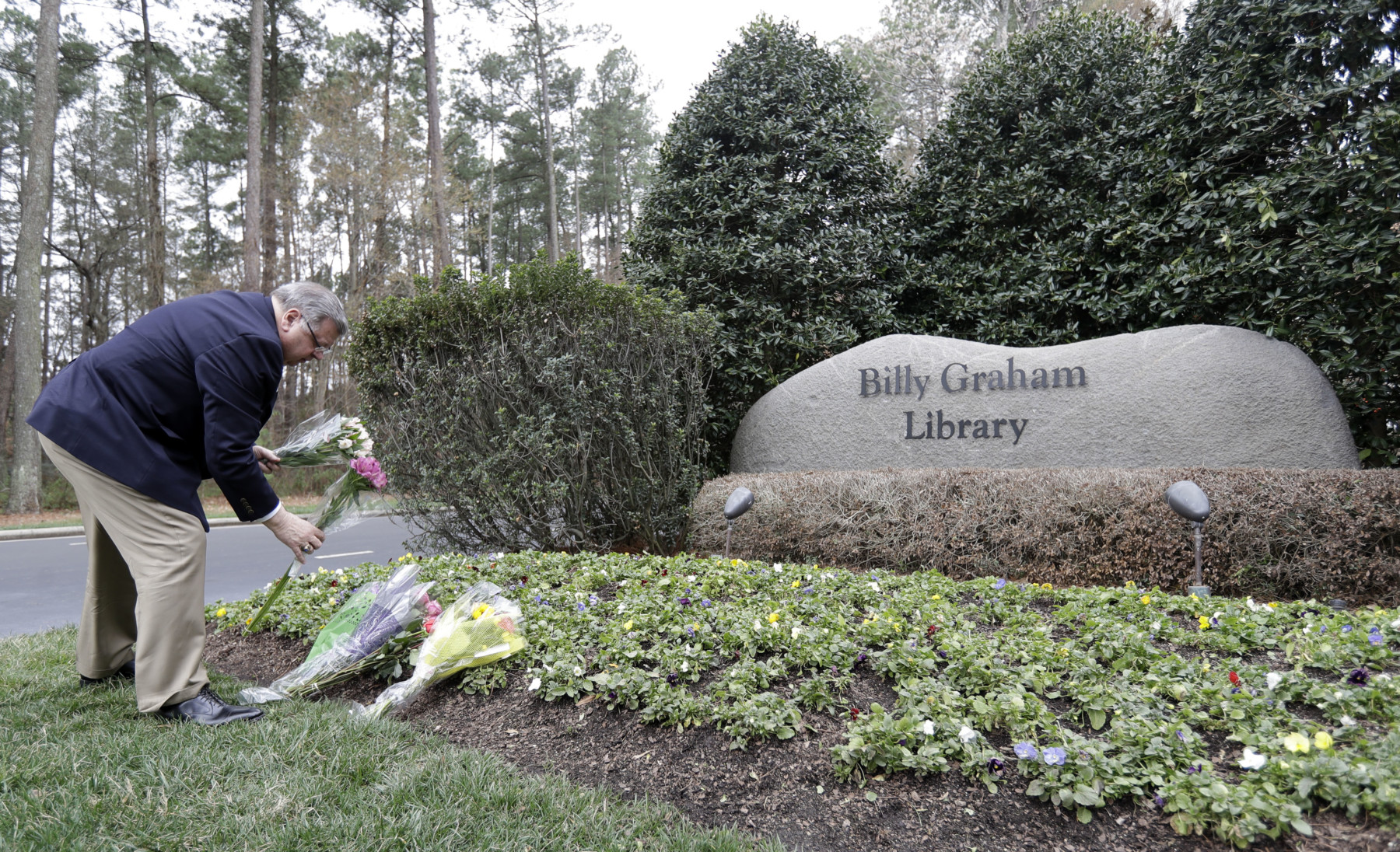 Billy Graham Library employee Howard Sharpe places flowers from visitors outside the entrance of the Billy Graham Library in Charlotte, N.C., Wednesday, Feb. 21, 2018. Graham, who transformed American religious life through his preaching and activism, becoming a counselor to presidents and the most widely heard Christian evangelist in history, has died. Spokesman Mark DeMoss says Graham, who long suffered from cancer, pneumonia and other ailments, died at his home in North Carolina on Wednesday, Feb. 21, 2018. He was 99. (AP Photo/Chuck Burton)
