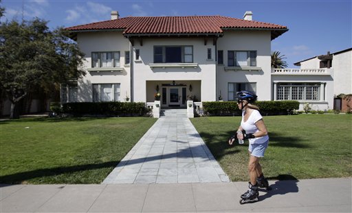 A woman passes the historic Spreckels mansion Thursday, July 14, 2011, in Coronado, Calif. A woman found dead at the historic mansion was nude and hanging from a balcony with her hands tied behind her back and her feet bound, investigators said Thursday. (AP Photo/Gregory Bull)