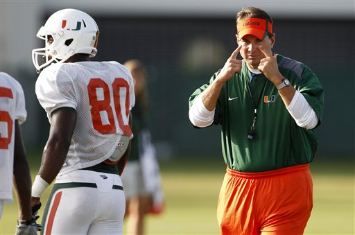 Miami’s head football coach Al Golden, right, gestures to a player during football practice in Coral Gables, Fla., Thursday, Aug. 18, 2011. Golden says his team is recovering from the shock of scandalous allegations hitting the program and sparking talk from the NCAA for “fundamental change” in college sports. At left is wide receiver Rashawn Scott (80). (AP Photo/Lynne Sladky)