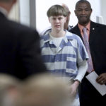 Roof appearing in black and white prisoner stripes and in shackles at the defendant's table,...